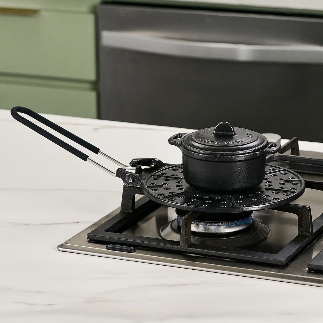 Fabricada en hierro fundido de alta calidad, esta parrilla garantiza una distribución uniforme del calor que realza el sabor y textura de cada preparación, manteniendo el calor por más tiempo y logrando cocciones precisas y deliciosas.