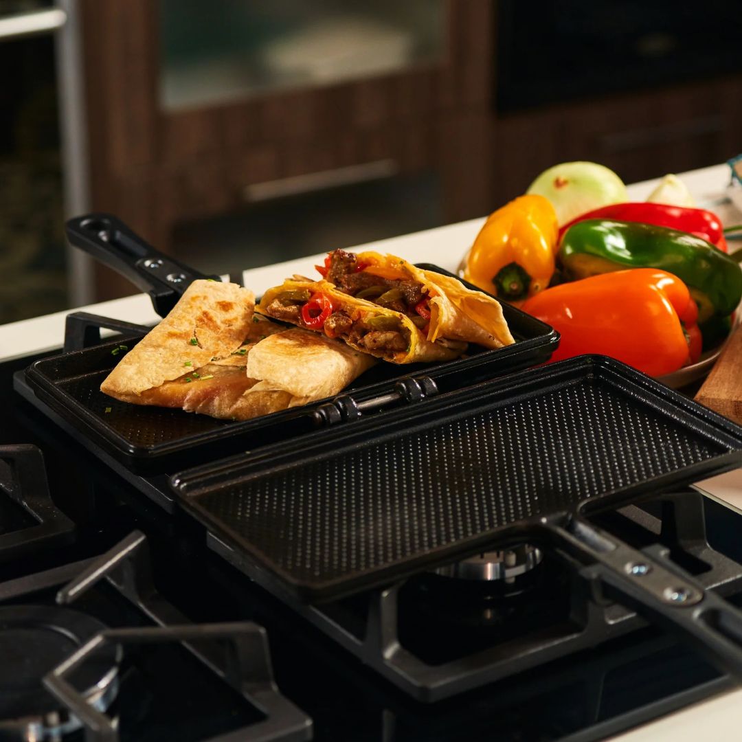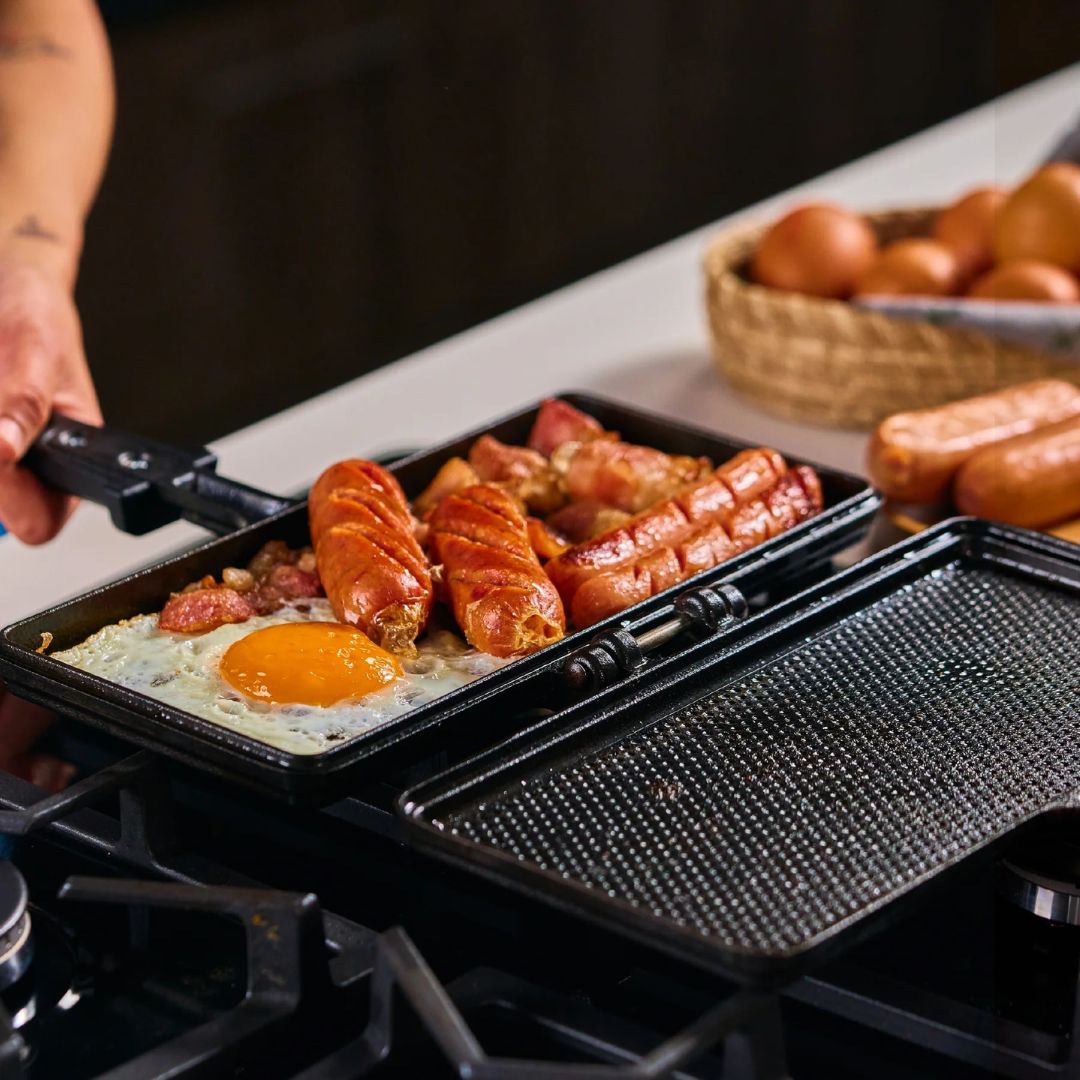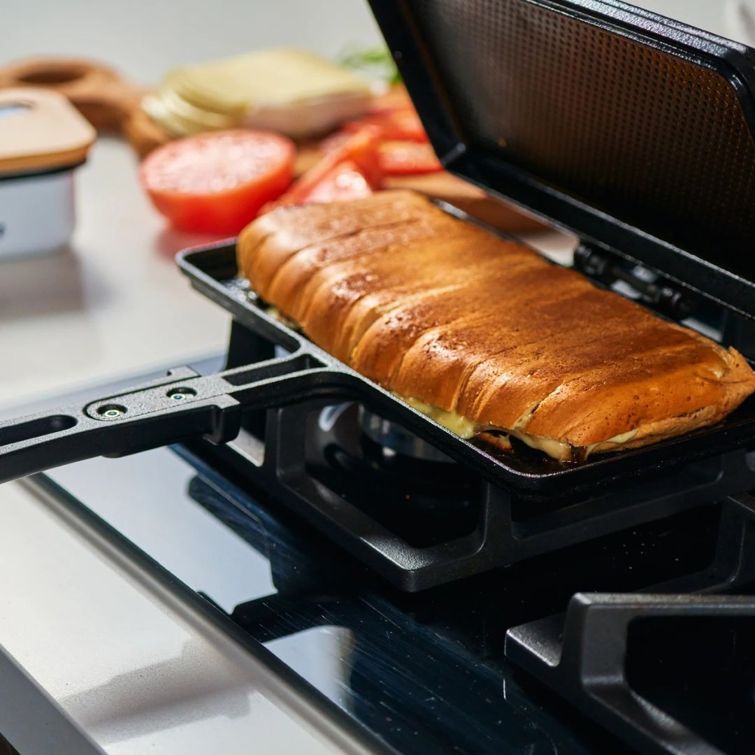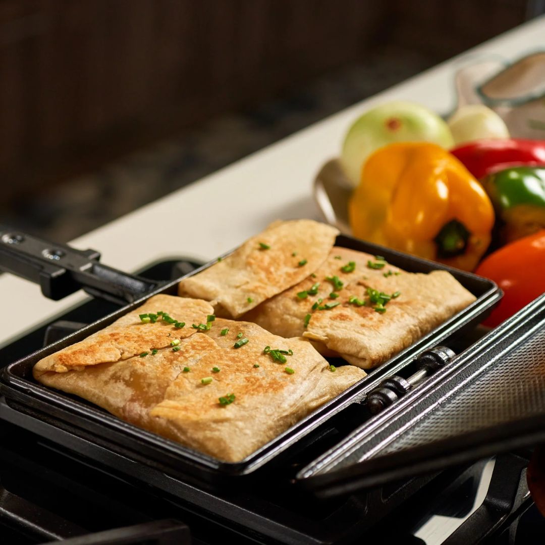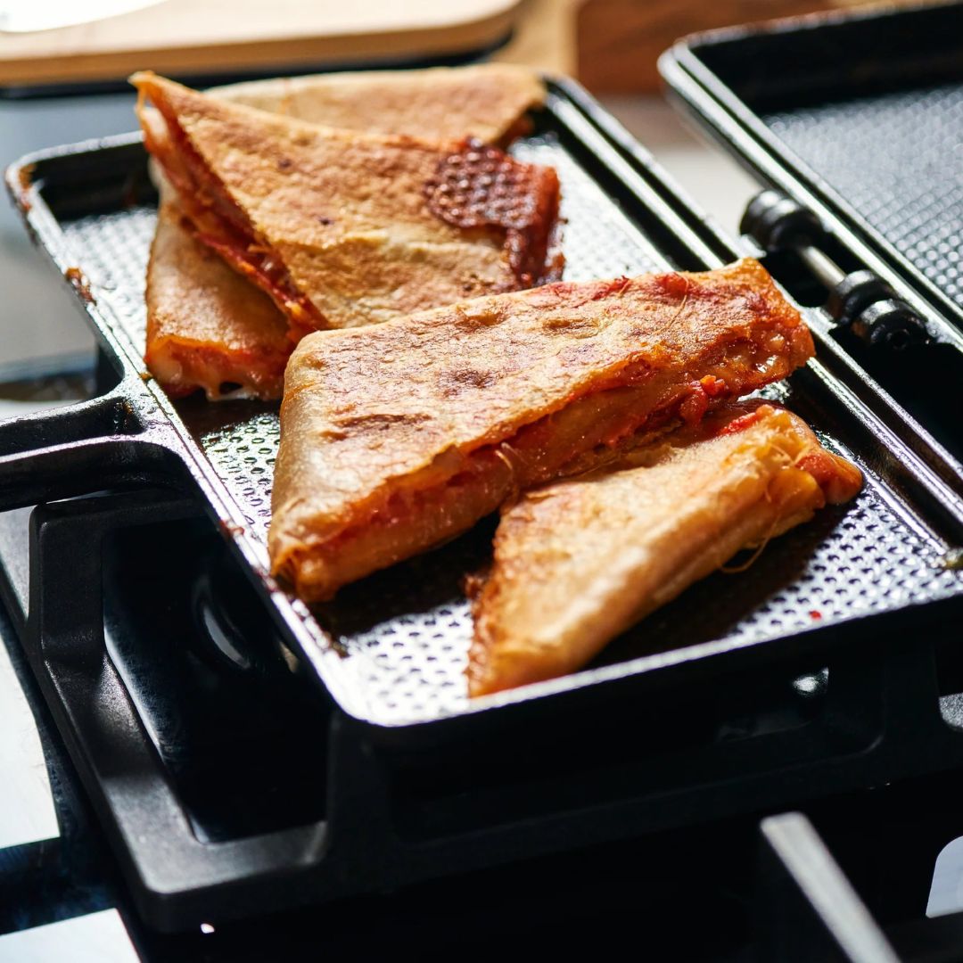 La sanduchera de hierro fundido curado Victoria está pensada para quienes buscan sabor auténtico, practicidad y una cocción saludable. Su diseño incluye un mango que no se calienta fácilmente y una superficie perforada que reduce el contacto con los alimentos, favoreciendo una antiadherencia natural y facilitando su extracción.