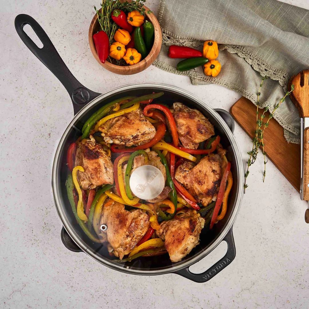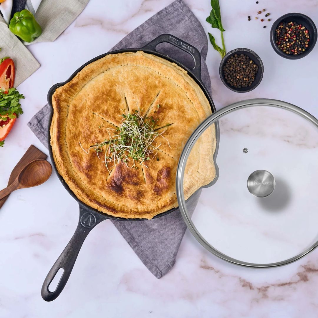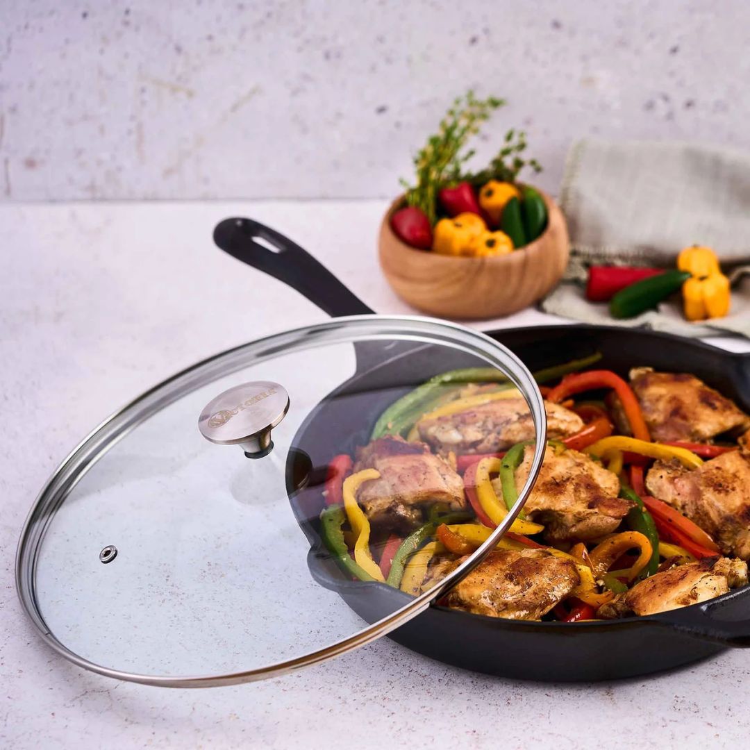 Tapa de vidrio templado que se ajusta al sartén de hierro fundido de 30 cm Victoria. Ayuda a la cocción a fuego lento mientras observas el progreso de tu preparación.